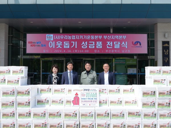 [뉴스서치] (사)우리농업지키기운동본부 부산지역본부는 지난 16일 부산 남구에 740만원상당의 농산품 꾸러미와 후원금 260만원을 전달했다.