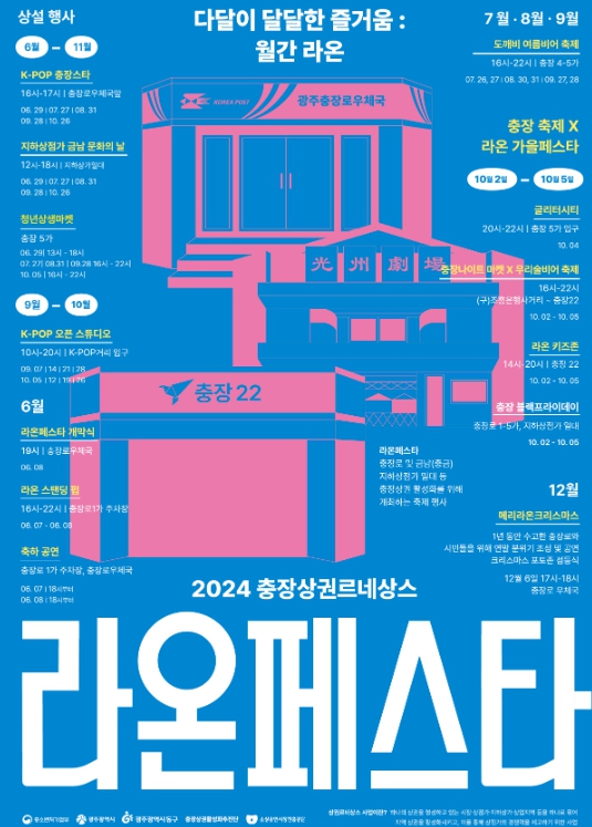 ‘2024 라온페스타’는 100억 원 규모의 충장상권 르네상스 사업 일환으로 마련됐으며, 올해는 ‘다달이 달달한 즐거움’을 주제로 충장로와 지하 상점가의 소비 촉진은 물론 지역경제 활성화를 위해 기획됐다.