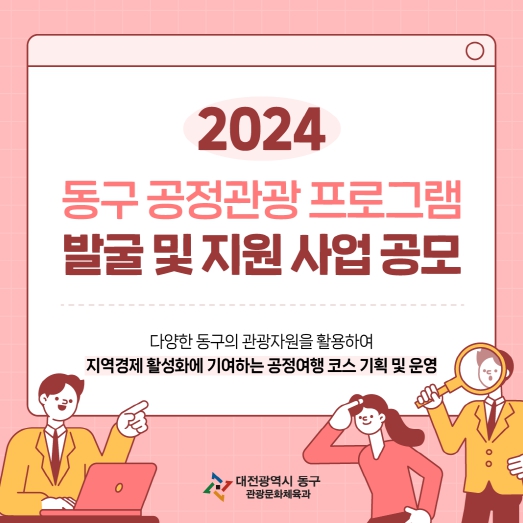 [뉴스서치] 대전 동구는 지역 내 자연‧역사‧문화‧먹거리 등 관광자원을 소재로 한 공정관광 프로그램 개발 및 운영비를 지원하는 ‘2024년 공정관광 프로그램 발굴 및 지원 사업’ 공모를 진행한다고 1일 밝혔다.
