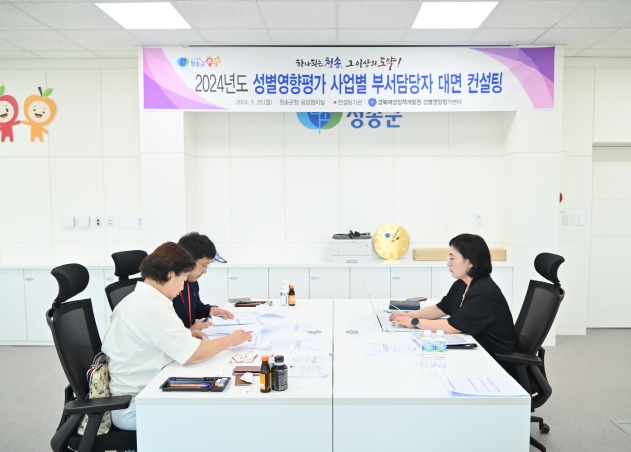 [뉴스서치] 청송군은 5월 20일 성별영향평가 대상과제 사업의 원활한 추진을 위해 성별영향평가센터 전문컨설턴트를 초청해 6개부서 12명 사업담당자를 대상으로 1대1 대면컨설팅을 실시했다.