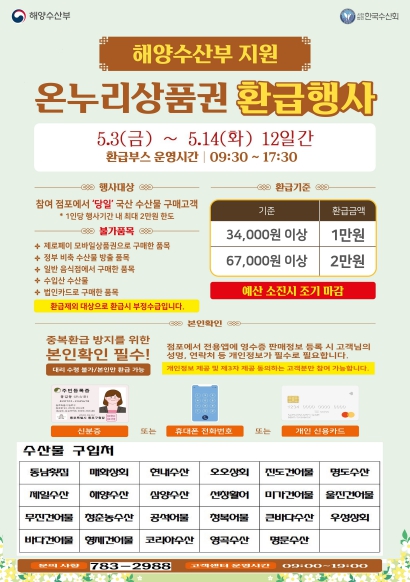 이번 행사는 해양수산부 주관 2024년 상반기 2차 수산물 온누리상품권 환급행사로 소비자 장바구니 부담을 완화 시키고 지역민의 수산물 소비 촉진 등 지역경제 활성화를 위해 추진됐다.