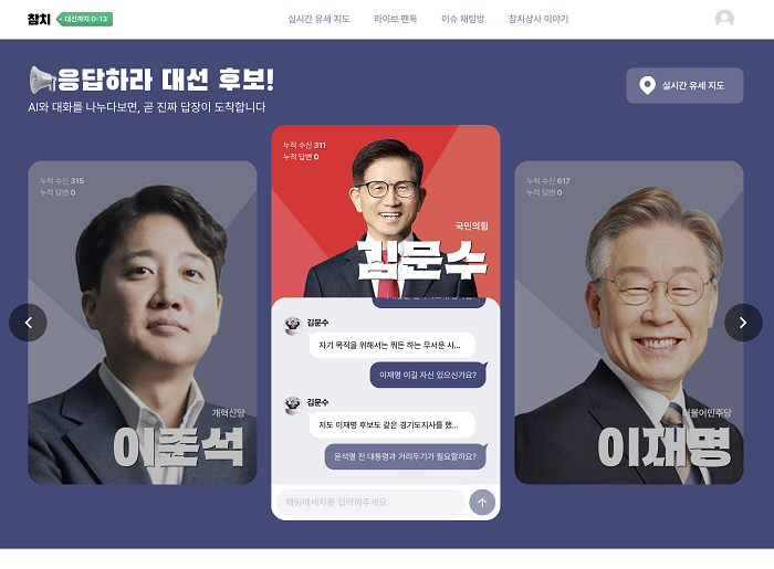 함께 공개된 ‘AI 문수·AI 준석·AI 영국’은 참치상사의 독자 기술(RAG 기반)을 활용한 생성형 AI 정치 채널이다. 각 후보의 공약, 연설, 인터뷰 등 실제 데이터를 학습한 AI가 유권자의 질문에 24시간 자동 응답하며, 실시간 대화와 이미지 콘텐츠를 통해 생생한 소통을 가능케 한다.