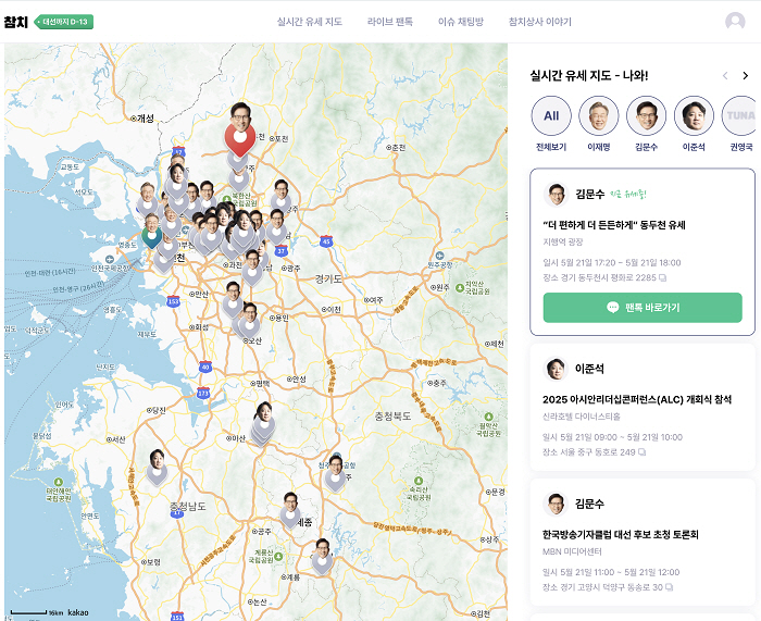 [뉴스서치] 젊은 세대의 정치 참여를 유도하는 새로운 디지털 정치 실험이 시작됐다. 폴리테크(Poli-Tech) 스타트업 참치상사는 대통령 후보 김문수, 이준석, 권영국 3인이 참여하는 쌍방향 정치 플랫폼 ‘참치’를 5월 21일 공식 런칭했다.