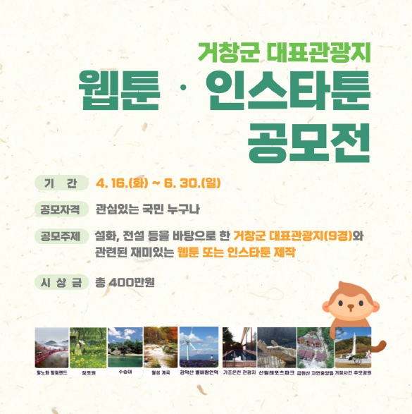 [뉴스서치] 거창군은 대표관광지 선정 후속사업으로 대표관광지와 관련된 다양한 스토리를 만화로 표현하는 웹툰‧인스타툰 공모전을 오는 6월 30일까지 개최한다.