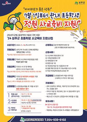 이번 초등학생 사교육비 지원사업은 매년 기부되는 별고을 장학기금을 활용한 학부모 부담경감을 위한 성주군의 저출생 극복대응 핵심사업으로▲성주군에 주소를 둔 관내 초등학생 전학년 대상 ▲학원 수강기간은 7월부터 12월까지 ▲1인당 월 10만원씩 4개월(연 40만원) ▲수강과목 관계없이 적법한 업체의 학원비(온라인 수강, 학습지 포함)를 지원 ▲신청방법은 최종 학원수강(4개월) 완료 후 1개월 내 일괄 청구 ▲지급방법은 신청월로부터 익월 학부모 계좌로 지급예정으로, 상세내용은 성주군청 및 별고을장학회 홈페이지 공지사항과 읍․면 행정복지센터를 통해 확인할 수 있다.