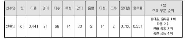 이번 시즌 KT의 중심 타자로 활약하고 있는 안현민은 7월 한달간 무려 타율 0.441을 기록하며 이 부문 리그 2위를 기록했다. 또한, 장타율과 출루율은 각각 0.706과 0.551로 해당 부문 1위에 올랐다.