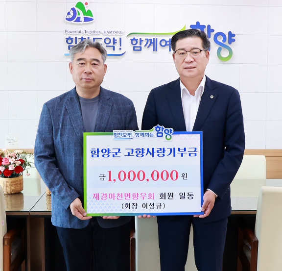 [뉴스서치] 함양 재경마천면향우회 회원 10명이 고향 함양의 발전을 응원하며 고향사랑기부금 100만 원을 전달했다.