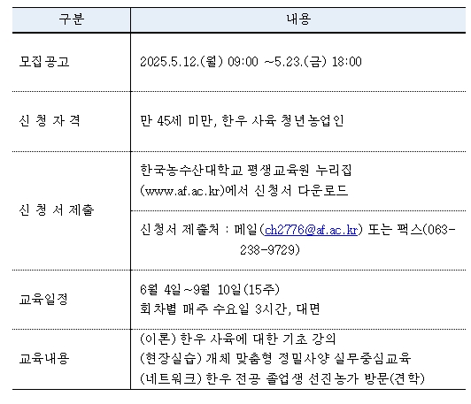한농대의「2025년 청년 영농 아카데미」교육생 모집공고는 5월 12일부터 5월 23일까지 진행된다. 만 45세 미만의 한우를 사육하는 청년 농업인이면 누구나 신청 가능하며, 신청서는 한농대 평생교육원 누리집에서 다운로드 받을 수 있다.