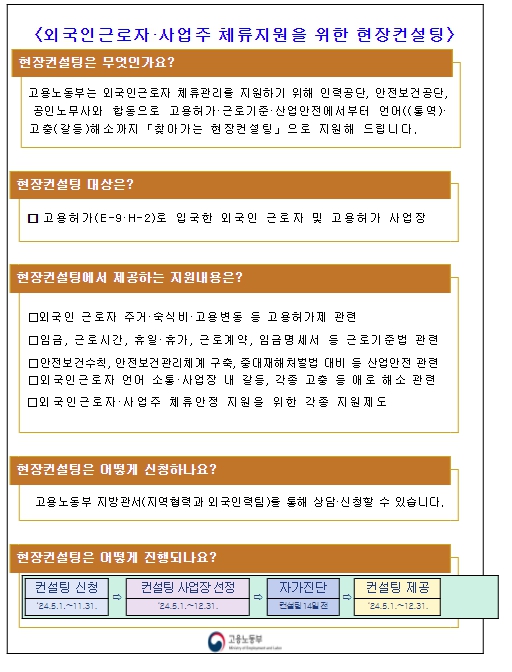 5월부터 외국인 근로자의 권익 침해를 예방하기 위해 사업주가 준수해야 할 노동관계 법령상 의무에 대해 종합적으로 안내·진단하는 관계기관 합동 ‘찾아가는 현장 컨설팅’을 시작했다.