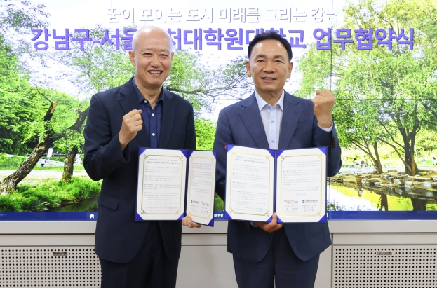 ▲ 협약식에 참석한 조성명 강남구청장(오른쪽), 김춘호 서울벤처대학원대학교 총장(왼쪽) |