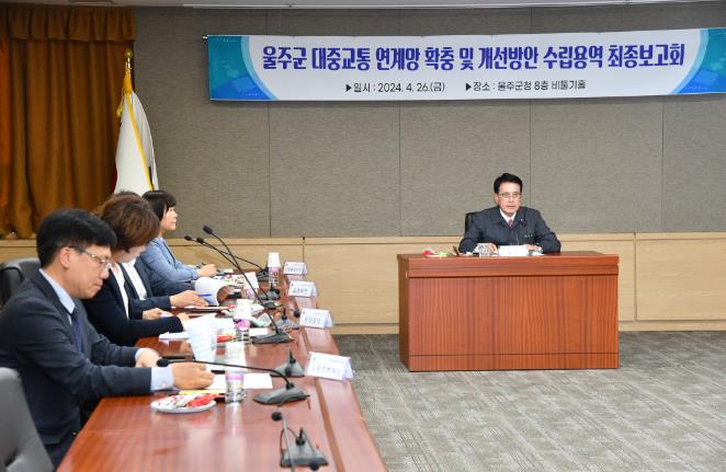 울주군은 26일 군청 비둘기홀에서 이순걸 군수 주관으로 관계 공무원과 군의원, 울산연구원 등 10여명이 참석한 가운데 ‘울주군 대중교통 연계망 확충 및 개선방안 수립 용역’ 최종보고회를 개최했다.