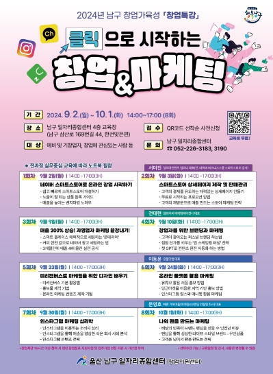 ‘클릭!으로 시작하는 창업&마케팅’ 교육은 일자리종합센터에서 실무중심으로 교육이 진행될 예정으며, 교육신청은 QR코드로 사전신청이 가능하다.