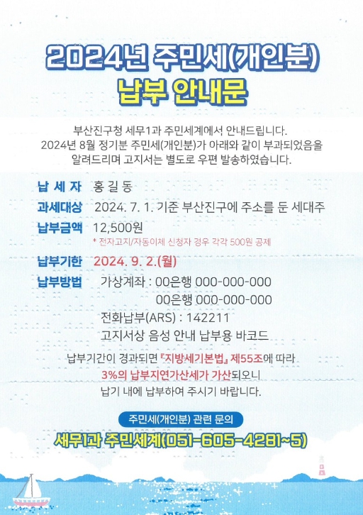 한편 8월에 부과되는 주민세(개인분)는 매년 7월 1일 현재 주민등록상 세대주에게 부과되며 세액은 주민세 10,000원, 지방교육세 2,500원 등 총 12,500원이 고지되며 9월 2일까지 납부하면 된다.