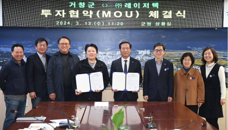 [뉴스서치] 거창군은 13일 군청 상황실에서 구인모 군수, 홍준영 ㈜레이저텍 대표와 관계자가 참석한 가운데 ㈜레이저텍과 투자협약을 체결했다.