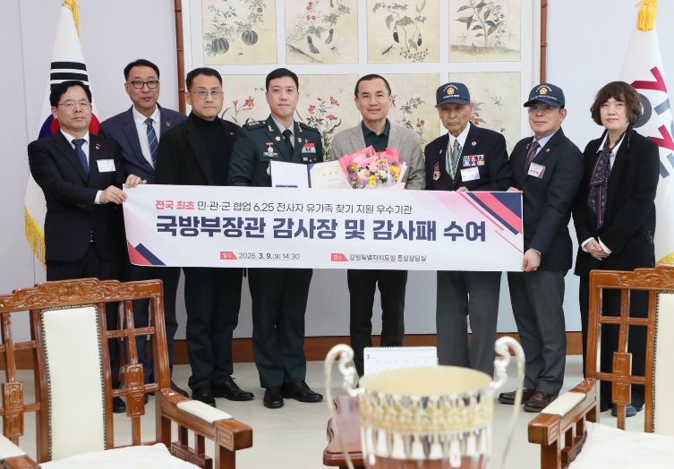 [뉴스서치] 강원특별자치도는 국방부 유해발굴감식단이 추진한 ‘2025년 민·관·군 협업 6·25전사자 유가족 집중 찾기’ 사업에서 전국 최초 민관군 협업 6.25전사자 유가족 찾기 지원 우수기관으로 선정돼, 3월 9일 국방부장관으로부터 감사장과 감사패를 수상했다고 밝혔다.