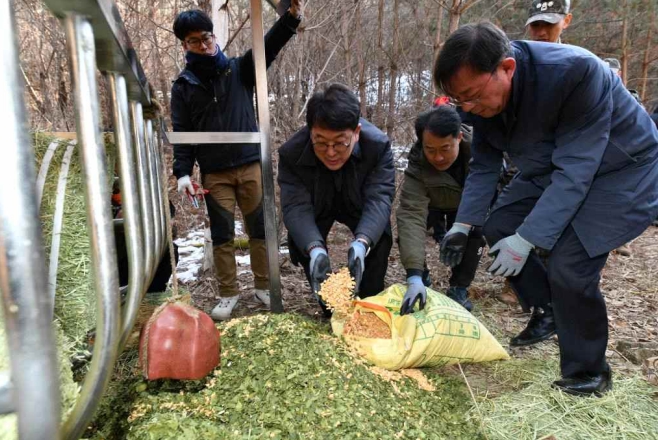 [뉴스서치] 국가유산청은 2월 14일 오전 11시에 강원 양구군, 군부대(21사단), 원주지방환경청, 강원야생동물의료센터, 한국수자원공사 등과 함께 양구군 방산면 천미리 일대에 위치한 천연기념물 산양의 먹이급이대와 쉼터에 먹이용 뽕잎 300kg, 건초(알파파) 1,000kg, 옥수수 300kg를 공급했다.