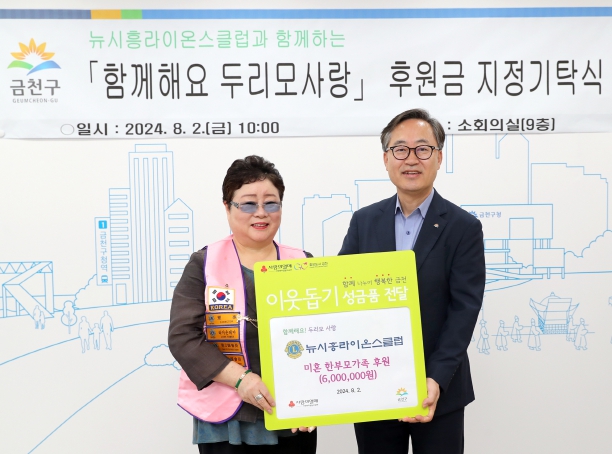 [뉴스서치] 금천구는 지난 2일 구청 9층 소회의실에서 뉴시흥라이온스클럽과 ‘함께해요, 두리모사랑’ 후원금 지정 기탁식을 개최했다고 밝혔다.