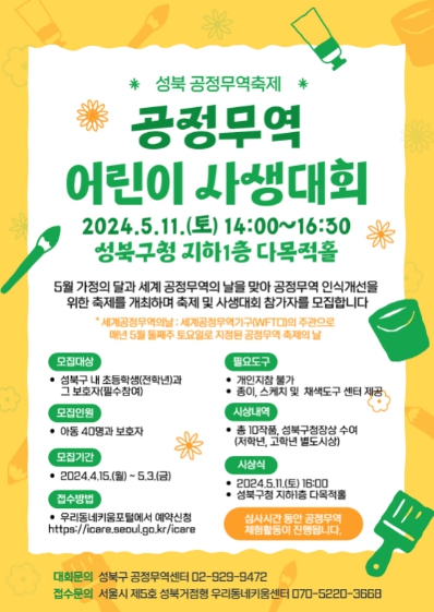 [뉴스서치] 서울 성북구가 다가오는 5월 가정의 달과 세계 공정무역의 날을 맞이해 공정무역 어린이 사생대회 참가자를 모집한다.