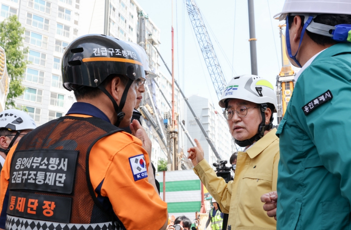 [뉴스서치] 김동연 경기도지사가 지난 5일 밤 천공기(지반을 뚫는 건설기계) 전도사고가 발생한 용인시 기흥구 서천동 인덕원~동탄 복선전철 공사 현장을 찾아 사고 수습 상황을 점검했다.