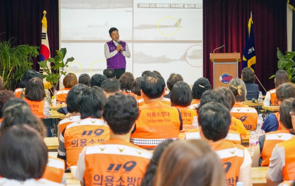 연단에 오른 이 구청장은 지난 5월 발생한 동대문환경자원센터 화재 진압을 위해 노력해준 동대문소방서와 의용소방대원들에게 감사의 뜻을 전한 뒤, 계속되는 사회적 재난을 예방하기 위한 방안에 대해 강연을 진행했다.