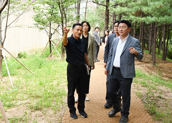 ▲ 김동근 시장이 용현산업단지 인근 녹지에 조성된 산책길을 점검하고 있다. |