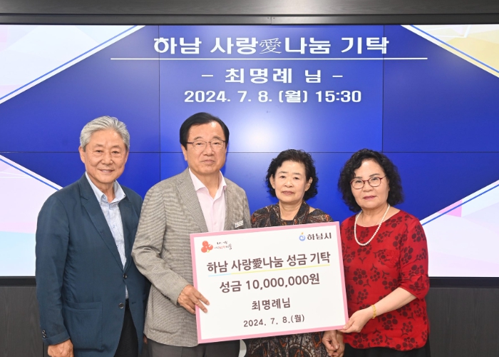 [뉴스서치] 하남시 관내 주민 최명례(개인)는 지난 8일 하남 사랑愛나눔 성금으로 1천만원을 기부하고 기탁식을 가졌다.