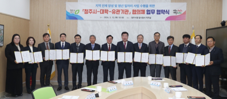 [뉴스서치] 청주시는 12일 임시청사 직지실에서 관내 대학교 8개소·유관기관 5개소와 지역 인재 양성 및 청년 일자리 사업 수행을 위한 업무 협약을 체결했다.