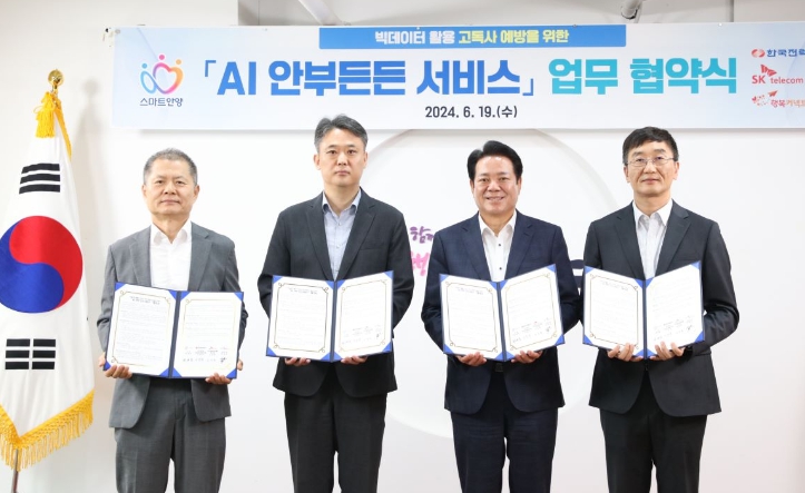 ▲ 안양시는 19일 오전 11시 안양시청 접견실에서 AI 안부 든든 서비스 업무협약을 체결했다.(왼쪽부터 박대호 (재)행복커넥트 상임이사, 이광직 한국전력공사 안양군포의왕 지사장, 최대호 안양시장, 김상목 SK 텔레콤 AI Enterprise사업 부사장) |