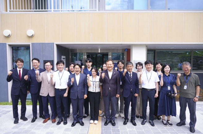 ▲ 강기정 광주광역시장과 이상민 행정안전부 장관이 1일 오전 서구 화정동 국립국가폭력트라우마치유센터를 방문해 내부시설을 둘러본 뒤 센터 관계자들과 기념촬영을 하고 있다. |