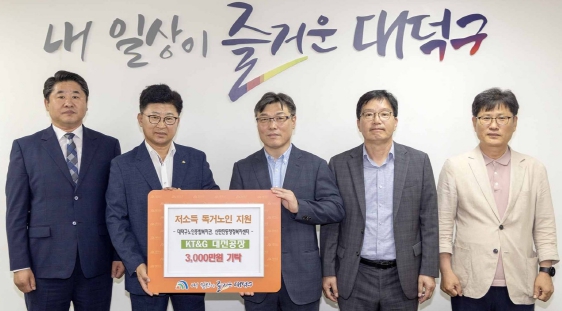 [뉴스서치] 대전 대덕구는 11일 KT&G 대전공장으로부터 지역 내 저소득 홀몸 어르신들을 위한 후원금 3000만원을 기탁받았다고 밝혔다.