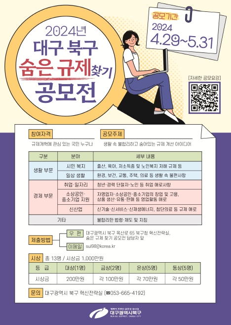 [뉴스서치] 대구 북구청은 일상생활에 불편을 주고, 기업 및 소상공인의 경제활동을 저해하는 불합리한 규제를 개선하기 위해 전국민을 대상으로‘2024년 대구 북구 숨은 규제 찾기 공모전’을 개최한다.