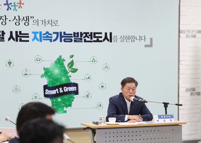▲ 광명시는 집중호우와 폭염 등 여름철 자연재난을 사전에 대비하기 위하여 박승원 시장 주재로 지난 18일 시청 중회의실에서 재개발·재건축 정비사업 공사장의 현장소장과 간담회를 개최했다. |