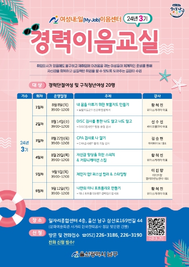 [뉴스서치] 울산 남구 여성내:일(My-Job)이음센터는 상반기에 이어 육아, 가사 등으로 경력이 단절된 여성 및 미취업 구직희망 여성들을 위한 ‘경력이음교실, 24년 3기’참여자를 모집 중이라고 11일 밝혔다.