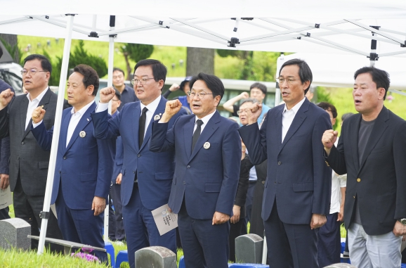 ▲ 강기정 광주광역시장이 5일 오후 북구 망월동 민족민주열사묘역에서 진행된 '제37주기 이한열 열사 추모식'에 참석해 임을 위한 행진곡을 제창하고 있다 |