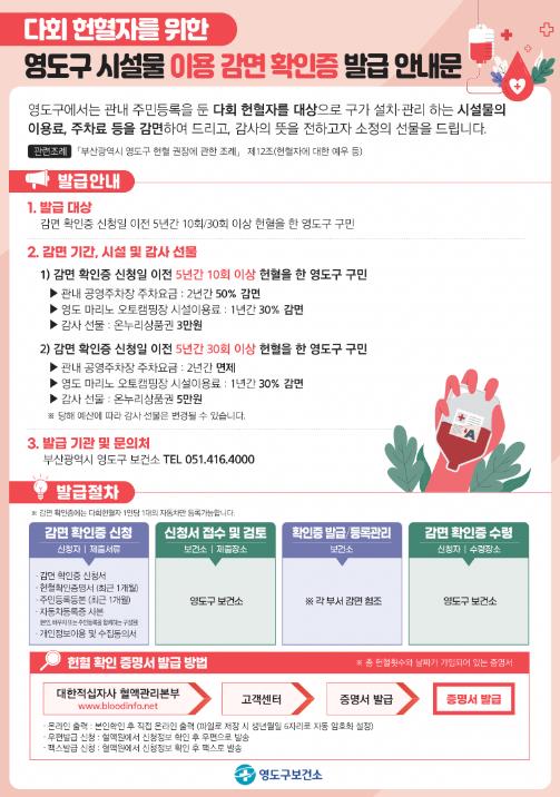 영도구 보건소에서는 '부산광역시 영도구 헌혈 권장에 관한 조례'에 따라 솔선수범하여 헌혈에 참여한 다회 헌혈자에게 구가 설치·관리하는 시설물에 대해 이용료를 감면해 주는 시설물 이용 감면 확인증을 발급하고 감사의 뜻을 전하고자 소정의 선물을 지급하는 헌혈자에 대한 예우 사업을 7월부터 실시 중에 있다.