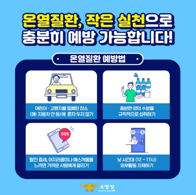 이에 소방관계자는 온열질환을 예방하기 위해서 충분한 수분 섭취, 한낮 야외활동 자제, 외출 시 모자, 자외선 차단제 사용으로 햇볕 차단, 햇볕에 장시간 노출 피하기 등 안전 수칙을 지켜줄 것을 당부했다.