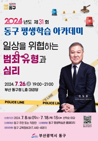 [뉴스서치] 부산광역시 동구는 오는 7월 26일 오후 7시부터 동구청 L층 대강당에서 제31회 동구 평생학습 아카데미를 개최한다. 이번 아카데미에서는 대한민국 1호 프로파일러인 권일용 교수를 초청하여 강연을 진행할 예정이다.