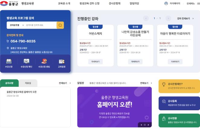 이에 울릉군 각 부서에서 분산되어 운영 중인 교육 프로그램을 통합 관리하는 평생교육원 홈페이지를 구축하여 관내 교육 정보를 한데 모아 군민의 평생학습 접근성을 높이고 평생교육의 중복 사업을 방지하고 다양한 연령층에서 평생교육을 누릴 수 있는 것에 중점을 뒀다.