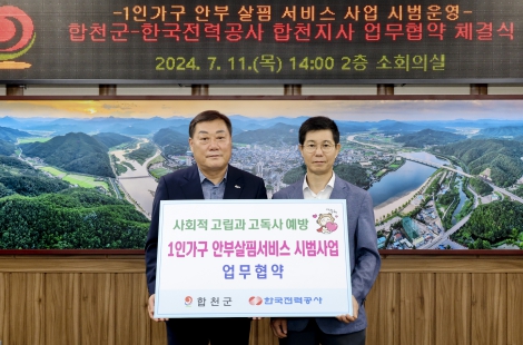 [뉴스서치] 합천군은 지난 11일 고독사 예방 및 사회안전망 구축을 위해 한국전력공사 합천지사와 ‘1인 가구 안부 살핌 서비스’ 업무협약을 체결했다.
