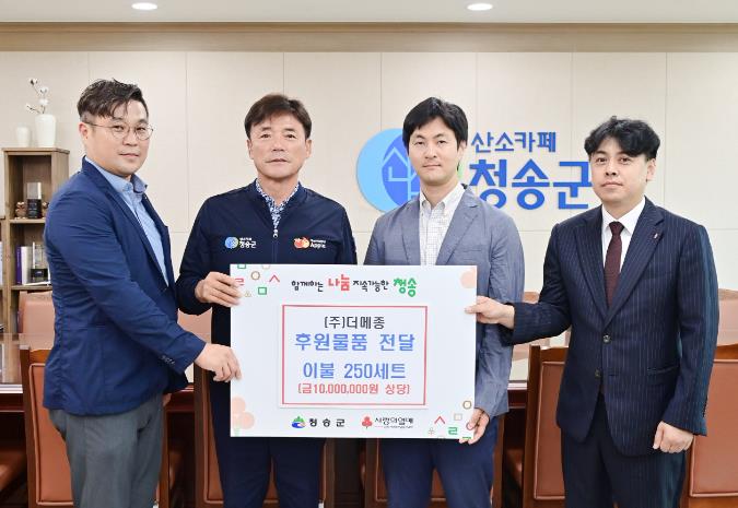 [뉴스서치] 청송군은 (주)더메종이 7월 11일 청송군 주민들을 위해서 이불 250세트(1,000만 원 상당)를 전달했다고 밝혔다.