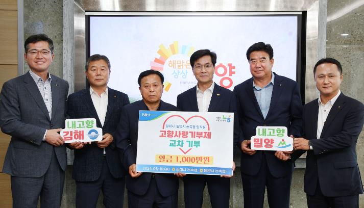 정창호 김해시 조합운영협의회의장은“밀양농협과 상호기부를 통해 고향 사랑 기부를 실천하게 돼 기쁘다”며“이번 기부를 통해 앞으로도 두 도시가 다양한 분야에서 교류하는 계기가 되길 바라며 고향사랑기부제에 대한 지속적인 관심과 참여를 부탁드린다”고 말했다.