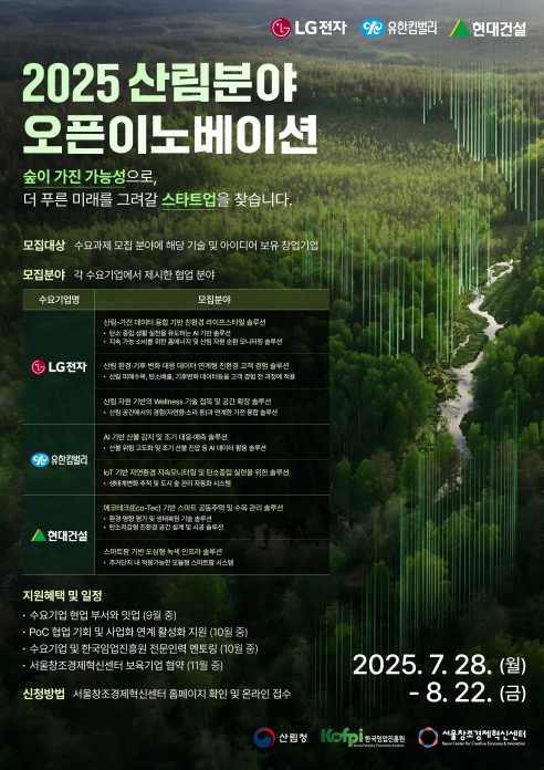 오는 28일 사업 공고를 시작으로 산림 분야 신사업에 관심이 있는 역량 있는 스타트업 등을 모집할 예정이다. 오픈이노베이션 참여기업은 휴양산업과 연계된 친환경 고객 경험 솔루션, 산불 감지·조기 대응 예측 솔루션, 공동주택 스마트 수목 관리 솔루션 등 대기업이 제시한 협업분야에서 산림 공공데이터를 활용해 독창적인 제품이나 서비스를 개발할 수 있다.