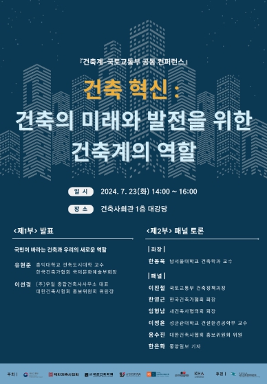 [뉴스서치] 국토교통부는 건축의 혁신과 지속가능한 발전을 논의하기 위한 공동 콘퍼런스를 건축계와 함께 7월 23일 오후 2시 서울(건축사회관)에서 개최한다.