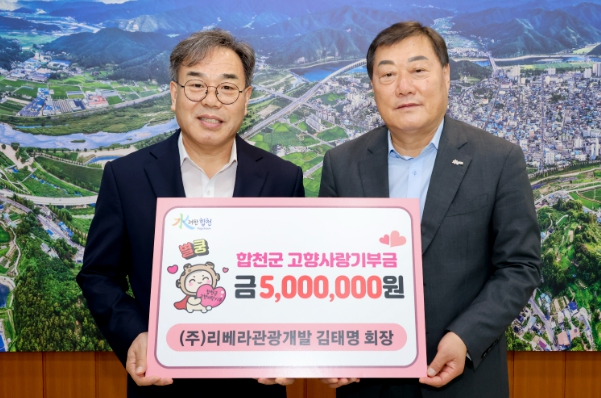[뉴스서치] 합천군은 지난 3일, ㈜리베라관광개발 김태명 회장이 합천군청을 방문해 고향사랑기부제 최고 금액인 500만원을 기탁했다고 밝혔다.