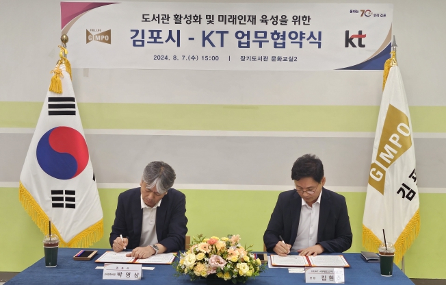 장기도서관에서 진행된 이날 협약식에는 김포시 교육문화국장과 KT서부법인고객1담당 단장 등이 참석했으며, 이번 협약을 통해 김포시는 참여 교육생 모집과 행정지원을, KT는 디지털 교육 프로그램의 실시와 교육플랫폼 제공 등을 함께 추진하게 된다.