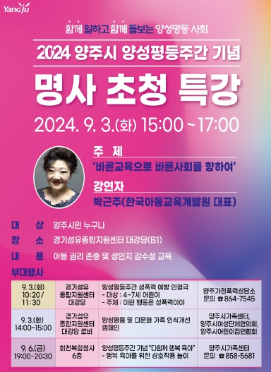 [뉴스서치] 양주시는 양성평등주간을 맞아 오는 9월 3일 경기섬유종합지원센터 대강당에서 명사 특강을 진행한다고 26일 밝혔다.