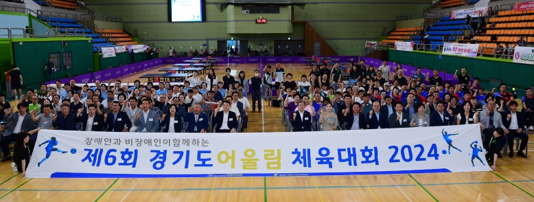 ▲ 지난 24일 광명시민체육관에서 개최된 '제6회 경기도어울림체육대회 2024 개막식'에서 참가자들이 기념사진을 촬영하고 있다. |