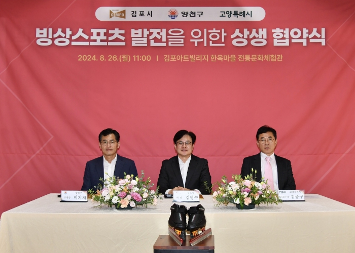 [뉴스서치] 김포시가 26일 김포아트빌리지에서 서울특별시 양천구, 고양특례시와 빙상스포츠 발전을 위한 상생 협약을 체결하며, ‘김포국제스케이트장 유치’에 대한 서부권의 결집을 이끌어냈다.