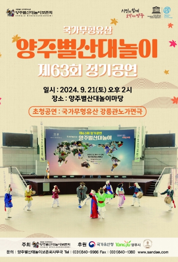 이번 정기공연은 유네스코 인류무형문화유산에 선정된 ‘한국의 탈춤’을 대표하는 양주별산대놀이 과장별 공연과 관람객들을 위한 다양한 체험프로그램이 준비되어 있다.