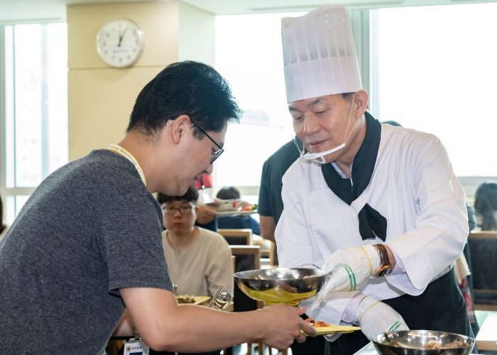 [뉴스서치] 이재준 수원시장이 초복을 맞아 15일 시청 구내식당에서 직원들에게 삼계탕을 배식하고 격려했다.